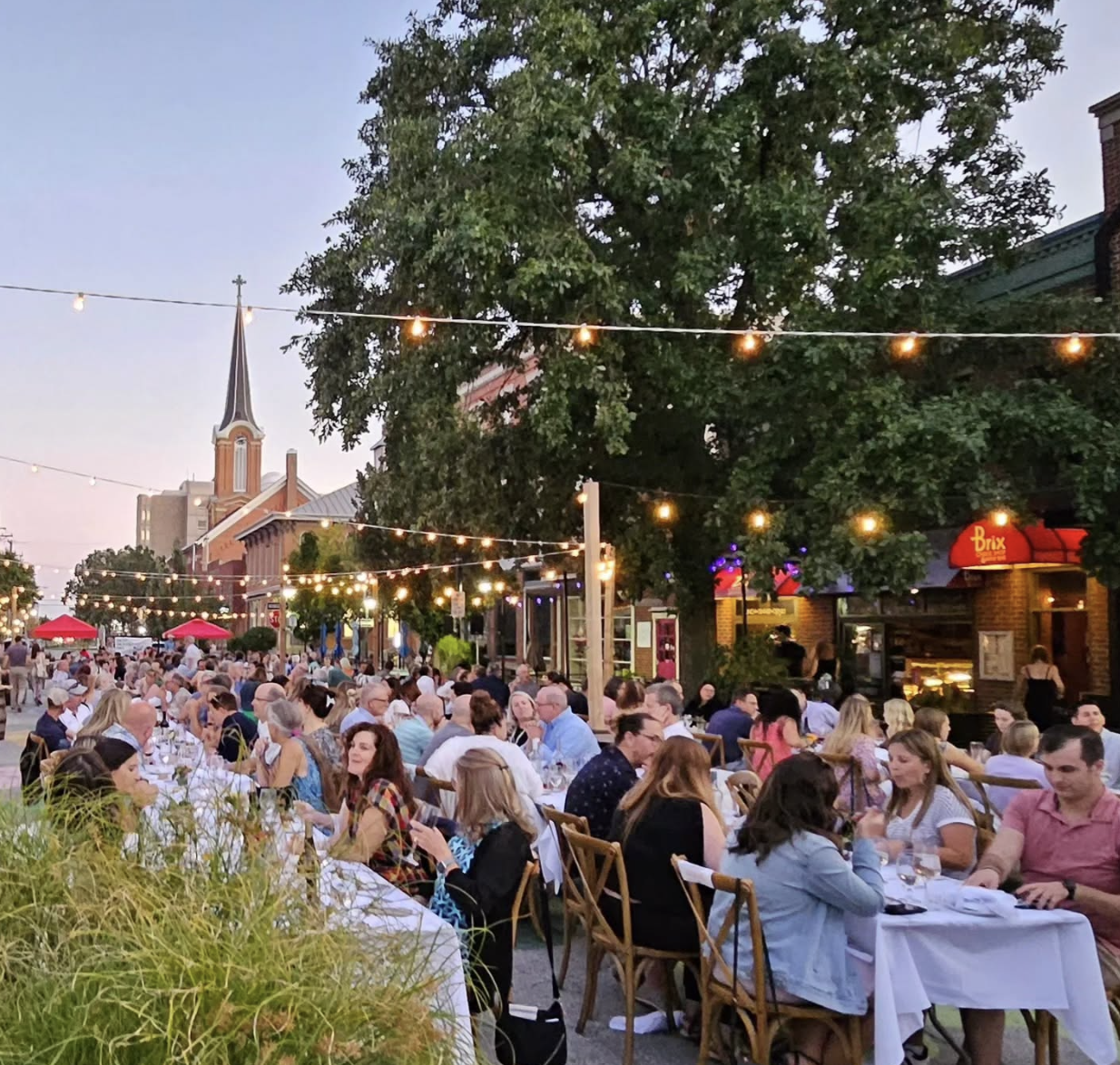 • Outdoor dining event with many people seated at tables under string lights on a city street, with a church and trees in the background at dusk.