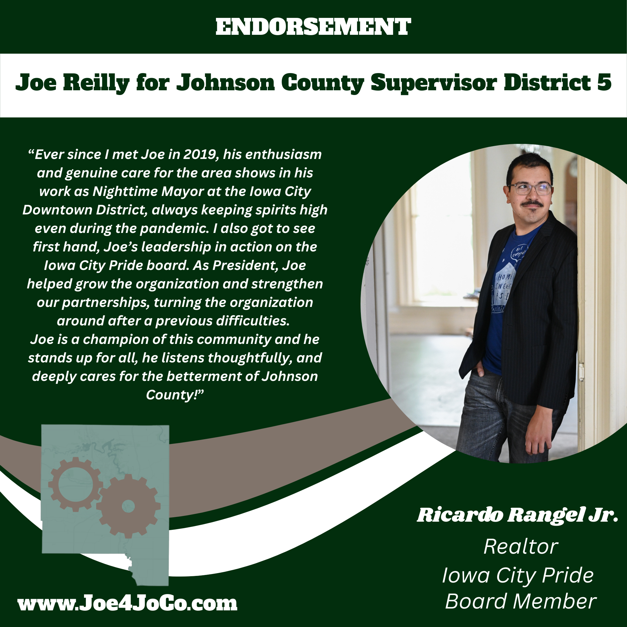 I’m Joe Reilly (he/him/his), a life long Iowan, 20 year Iowa Citian and a 15 year resident of Johnson County Supervisor District 5, with my husband, John!